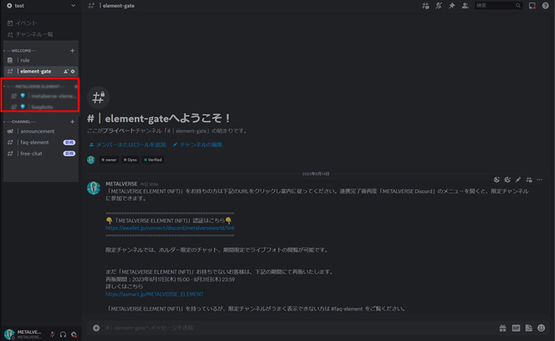Please note that the current "free-chat" will be closed at the end of August 2023, in conjunction with the opening of the "metalverse-element" limited channels. Please enjoy the chat on "metalverse-element-chat" in the future.